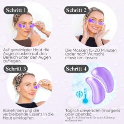 Einfache Anwendung: Gesicht reinigen, Pads 15–20 Minuten unter die Augen legen, entfernen und mit einer sanften Massage die Wirkung maximieren. Perfekt für die tägliche Routine.